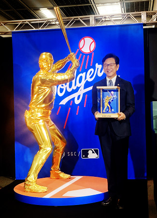 金製品を販売する「横浜大黄金展」が1日、横浜高島屋で始まり、米大リーグのドジャースで活躍する大谷翔平選手の等身大黄金像が展示された。写真は除幕式に参加した栗山英樹さん=横浜市 【時事通信社】
