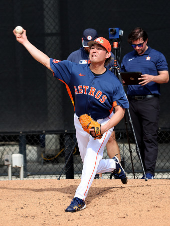 米大リーグの春季キャンプは14日、アリゾナ、フロリダ両州の各地で行われ、アストロズに移籍した今井はブルペン入りし、変化球を交えて21球を投げた=フロリダ州ウエストパームビーチ 【時事通信社】