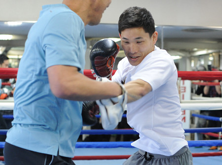 防衛戦に向け練習するWBAミニマム級王者の松本流星(右)=2日、東京都新宿区 【時事通信社】