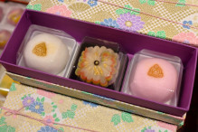 催場では、グルメや工芸品を販売。老舗和菓子店「森八」が、紅白まんじゅうと伝統的な5つの色「加賀五彩」を表現した上生菓子のセット(1,502円、各日限定30セット)を同催事限定で用意する。「プレミアム紅ずわいがに棒寿し」(2,376円)やブリの切り身をカブの塩漬けで挟んだ「かぶら寿(す)し」(1,296円~)などグルメのほか、ヨモギとユズの生麩(なまふ)や粒あんをのせた「生麩ソフトクリーム」(751円)や金箔(きんぱく)1枚を貼り付けた「金箔ソフトクリーム」(1,201円)などソフトクリームもそろえる。