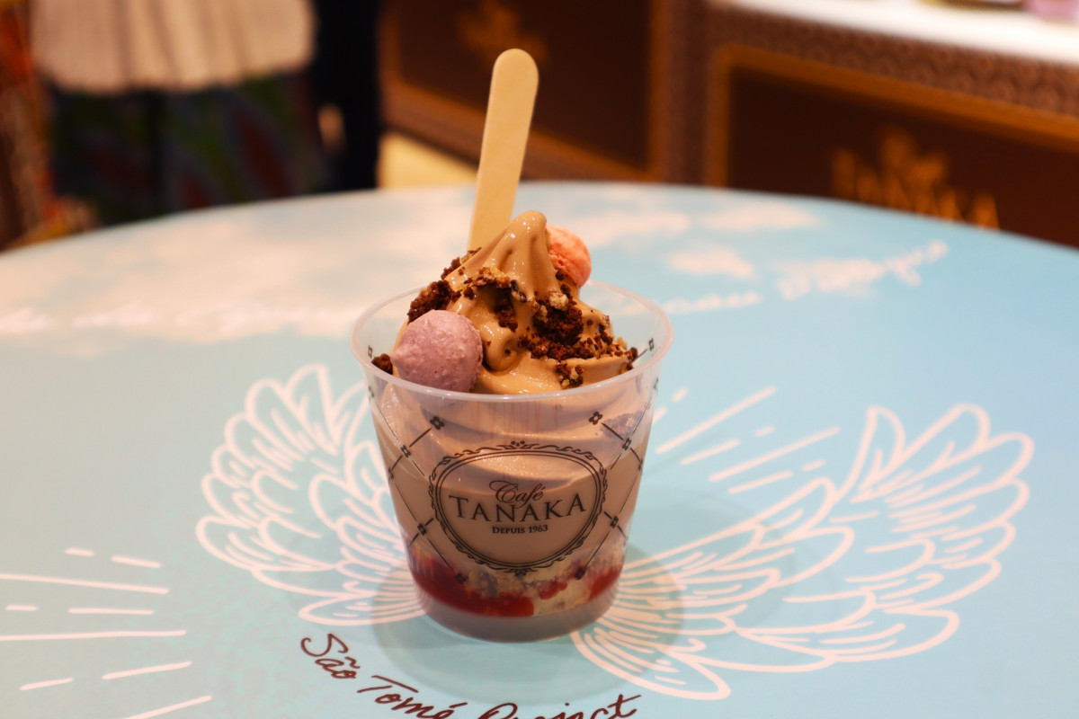 パティスリー「カフェタナカ」が10月1日、西アフリカ・サントメ島産のカカオを使ったスイーツを販売するイベントを阪急うめだ本店地下1階「ツリーテラス」で始めた。同イベント限定の「絞りたて!ソフティエ・フレ・サントメ・フランボワーズ」