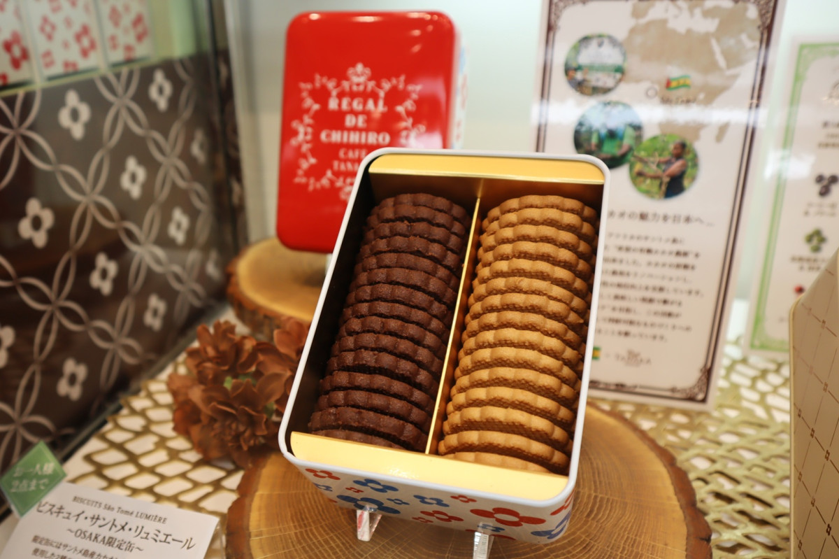 パティスリー「カフェタナカ」が10月1日、西アフリカ・サントメ島産のカカオを使ったスイーツを販売するイベントを阪急うめだ本店地下1階「ツリーテラス」で始めた。万博会場でも販売する「ビスキュイ・サントメ・リュミエール~OSAKA限定缶~」
