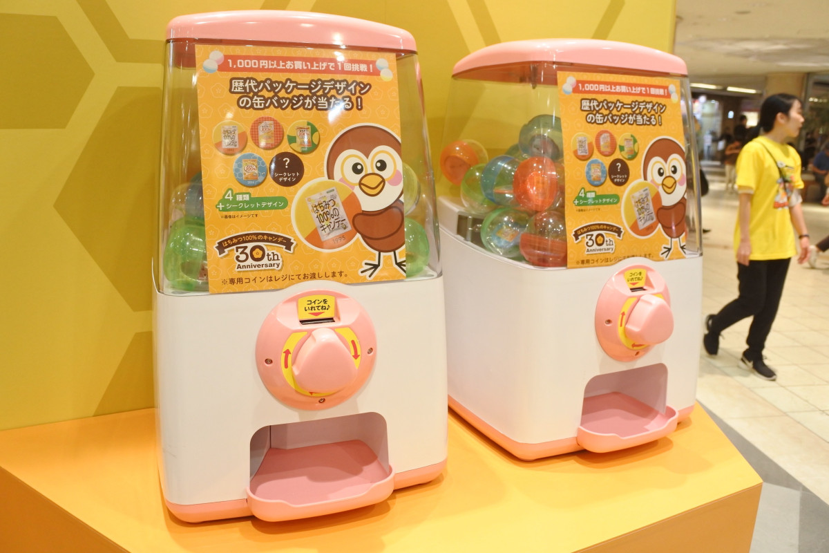 「はちみつ100%のキャンデー」の発売30周年を記念するポップアップイベントが10月10日、ディアモール大阪で始まった。缶バッジが当たるカプセルトイコーナーも