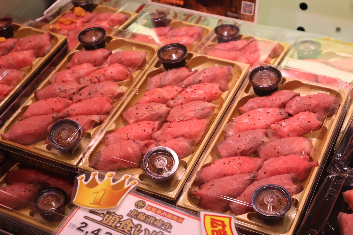 北海道のグルメやスイーツを集めた物産展「阪神秋の北海道市場」が10月15日、阪神梅田本店8階催事場で始まった。5種類の部位を食べ比べてもらう「北海道産牛一頭食い肉ずし」