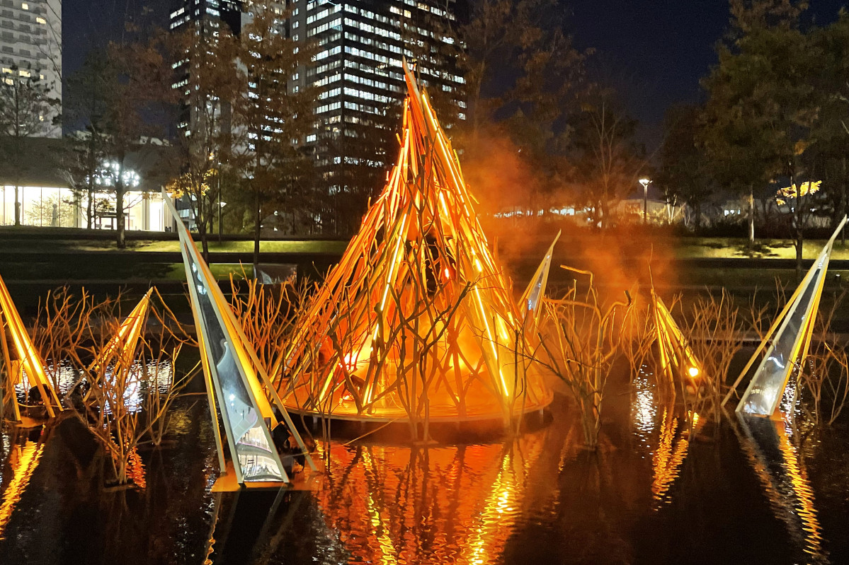 クリスマスイベント「GRAND GREEN HOLIDAY 2025」が12月4日、グラングリーン大阪のうめきた公園サウスパークで始まった。約5分間の炎の揺らぎをイメージしたショーの様子