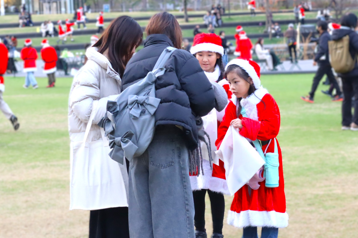 約650人がサンタクロースに扮して来街者をもてなすクリスマスイベント「Grand Santa Parade in UMEKITA」が12月23日、うめきたエリアで開催された。来街者にカードを渡す子どもサンタ