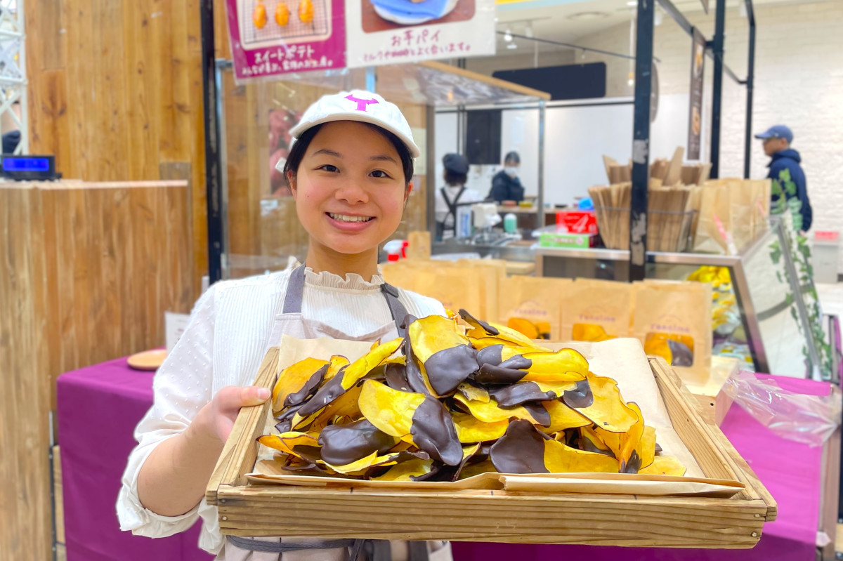 紅あずまを揚げてチョコをディップした「パリッと芋ショコラ」