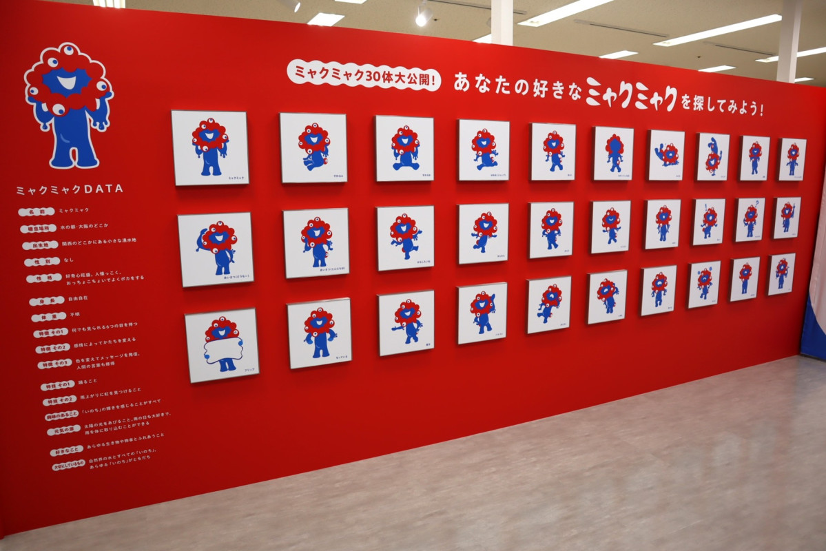 30種類のポーズを取るミャクミャクのイラストパネル