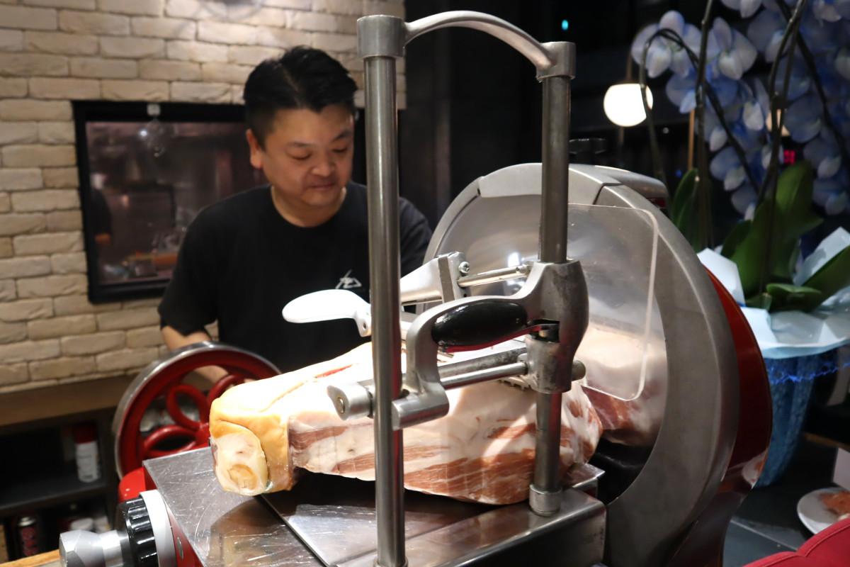 手動スライサーで薄く切り出して提供する「プロシュート」
