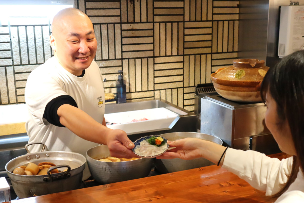 立ち飲み店「立ち呑み 大阪ふぐ太郎」(大阪市北区芝田1)が3月15日、29歳以下の来店客を対象に「てっさ」を無料提供する企画「U-29(アンダーフグ)」を始めた。