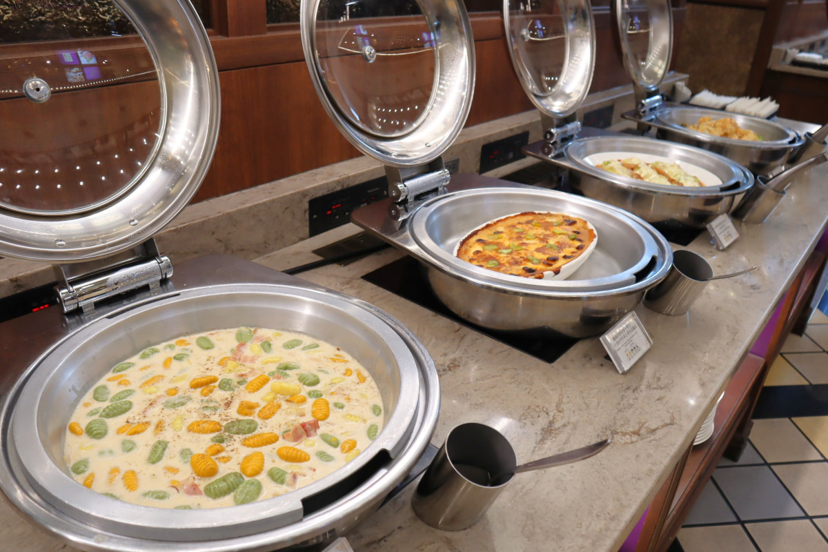 ホテル阪急インターナショナル1階のレストラン「ナイト&デイ」が現在、春のビュッフェ「Spring Buffet-ホテルが魅せる、春爛漫の味わい-」を開催している。ニョッキやグラタンなど温かいメニューが並ぶ