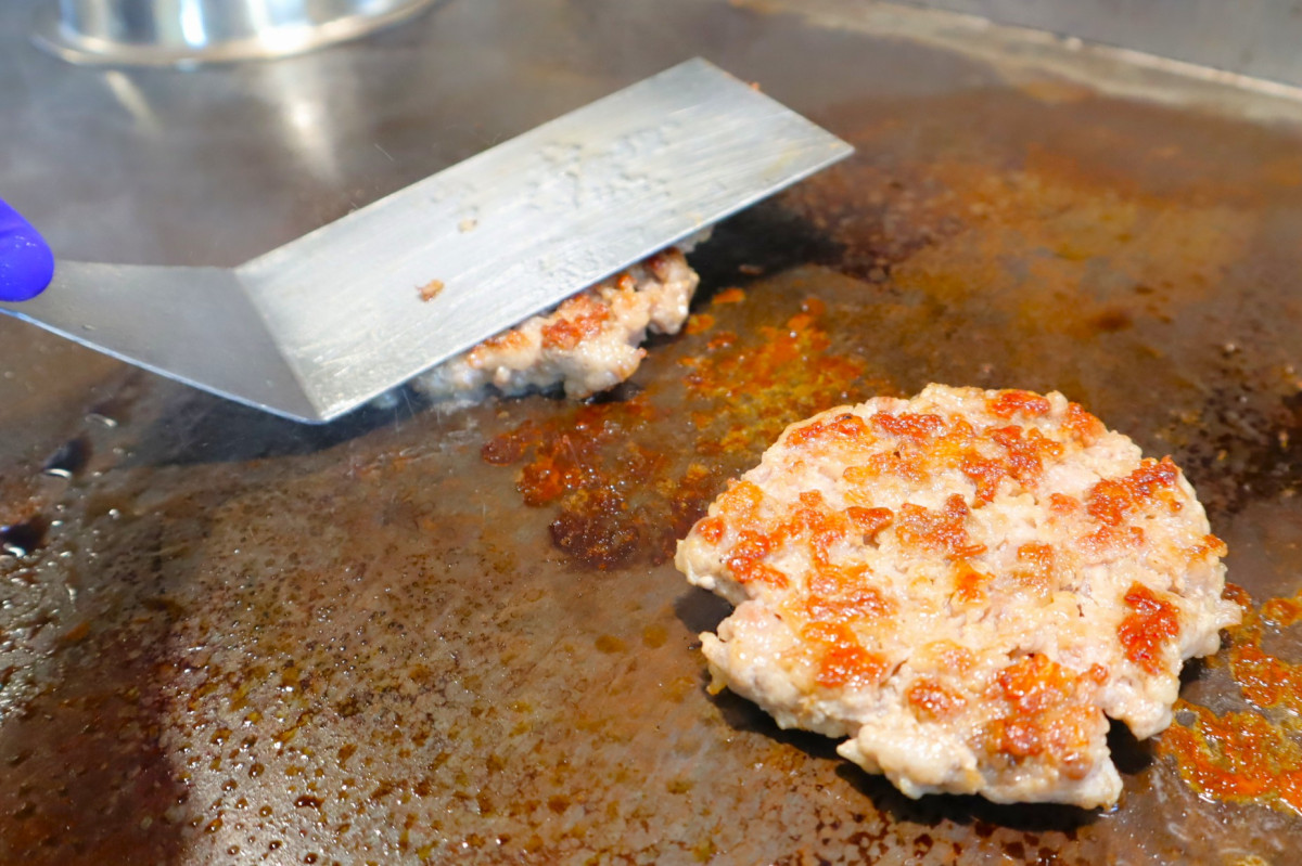 鉄板で焼き上げる「四万十ポーク」のパティ