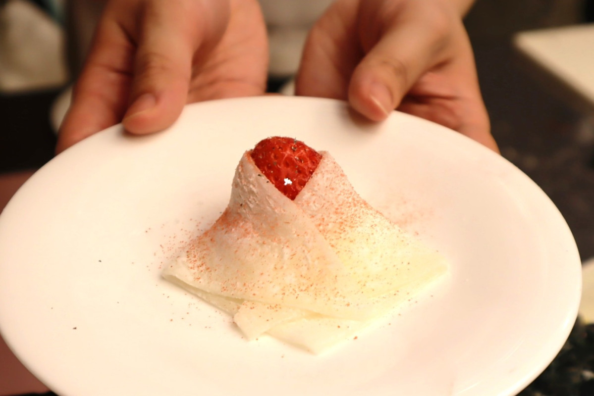 客の目の前で仕上げる「いちご大福 カカオパルプクリーム」