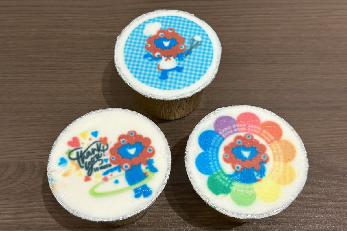 店内で生クリームにイラストをプリントする「ミャクミャクチーズケーキ」